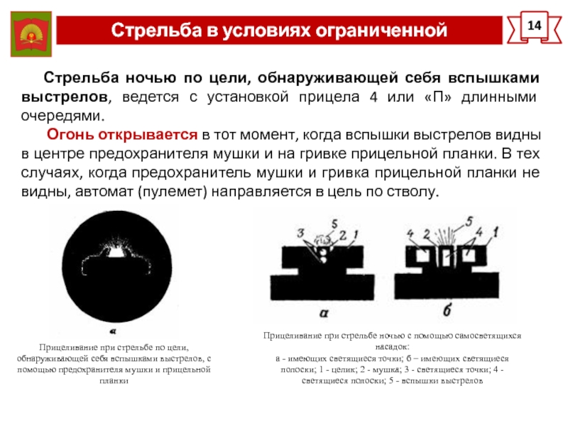 Прицеливание при стрельбе по цели, обнаруживающей себя вспышками выстрелов, с помощью предохранителя мушки и прицельной планки