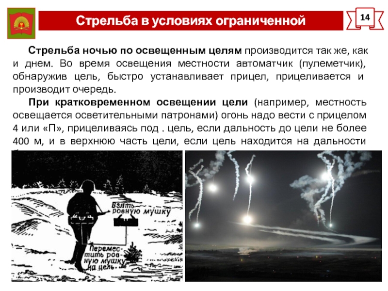 Если условия обстановки не позволяют изменять установку прицела в зависимости от дальности до цели, то в пределах дальности прямого выстрела огонь следует вести с прицелом, соответствующим дальности прямого выстрела, прицеливаясь в нижний край цели.