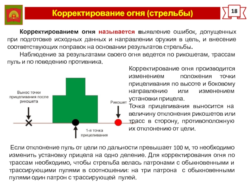 Точка прицеливания выносится на величину отклонения рикошетов или трасс в сторону, противоположную их отклонению от цели.