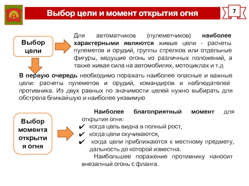 В первую очередь необходимо поражать наиболее опасные и важные цели: расчеты пулеметов и орудий, командиров и наблюдателей противника. Из двух равных по значимости целей нужно выбирать для обстрела ближайшую и наиболее уязвимую