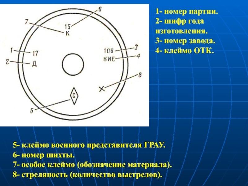 11- номер снаряжательного завода, партия и год снаряжения снарядов.