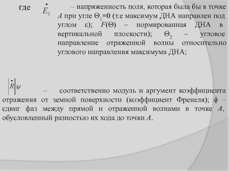– соответственно модуль и аргумент коэффициента отражения от земной поверхности (коэффициент Френеля); – сдвиг фаз между прямой и отраженной волнами в точке А, обусловленный разностью их хода до точки А.