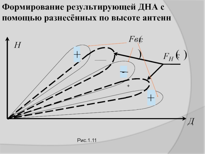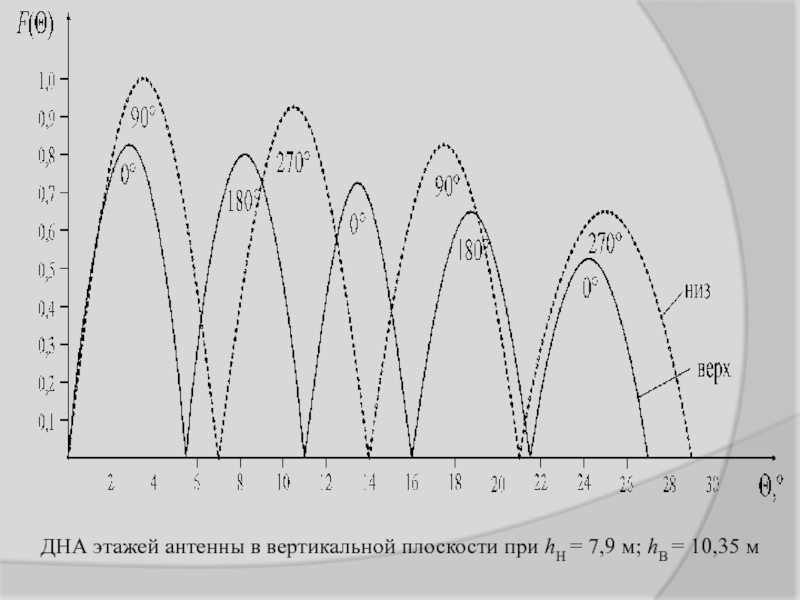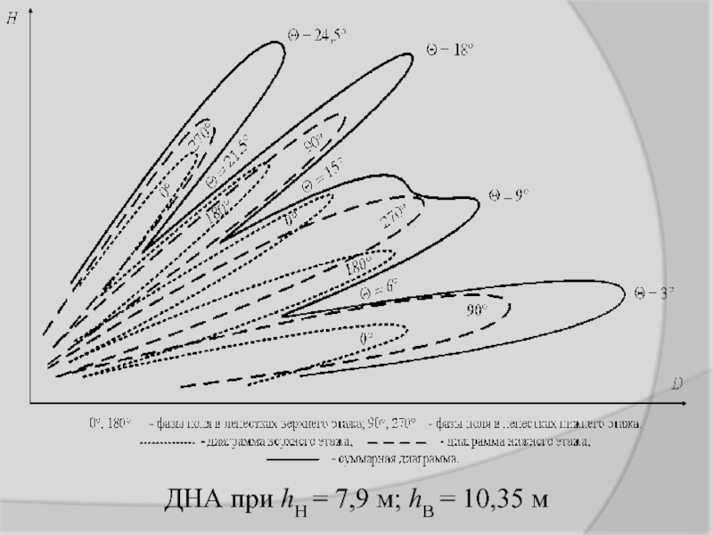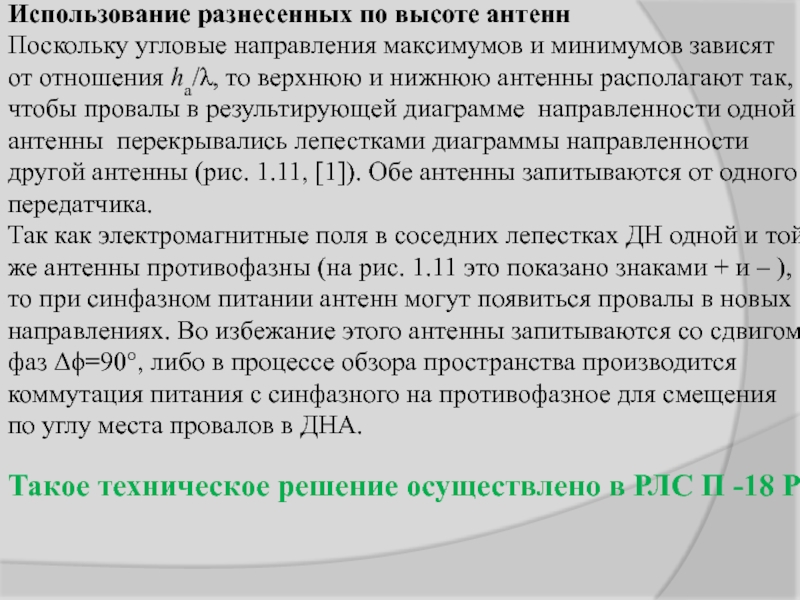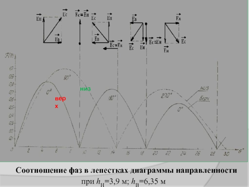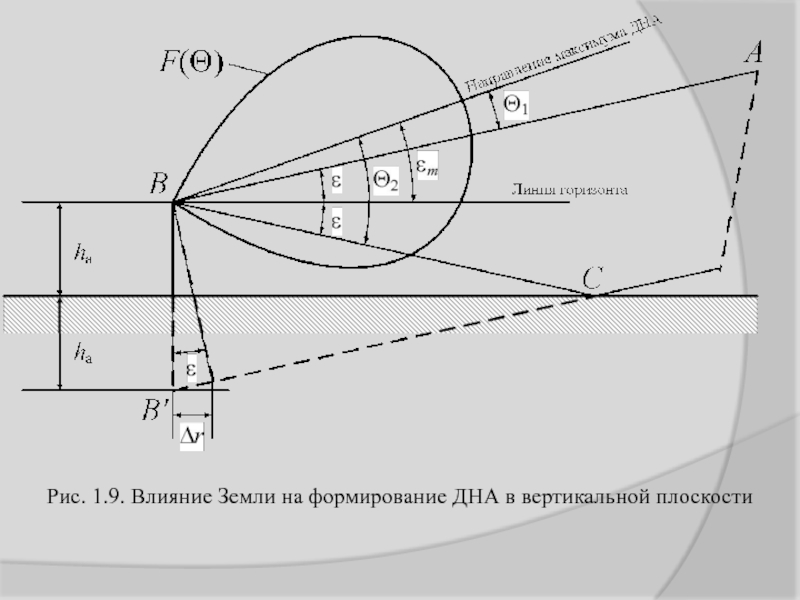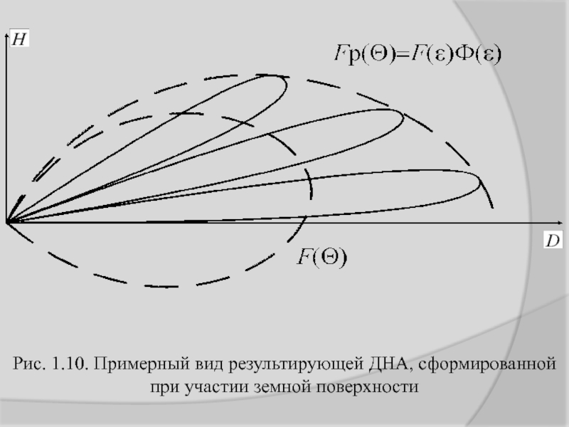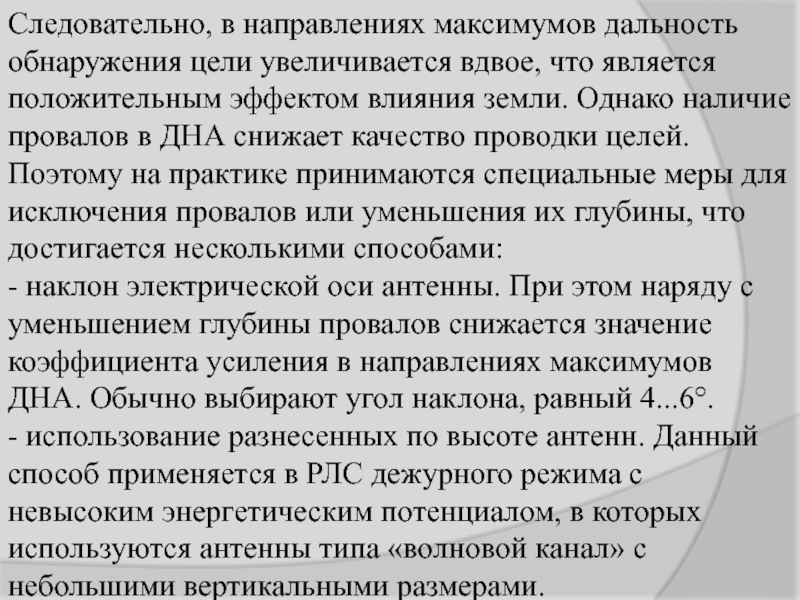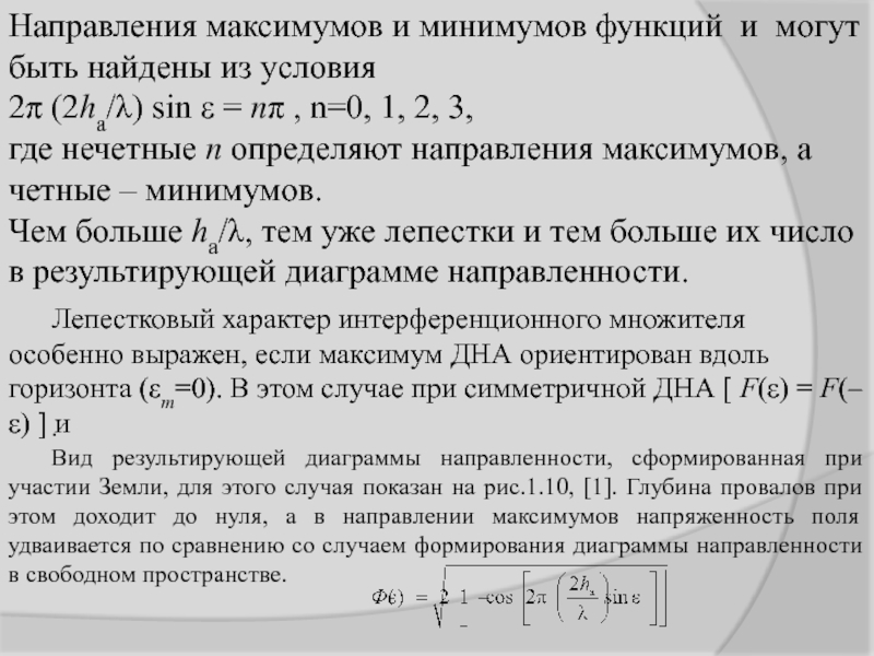 Вид результирующей диаграммы направленности, сформированная при участии Земли, для этого случая показан на рис.1.10, [1]. Глубина провалов при этом доходит до нуля, а в направлении максимумов напряженность поля удваивается по сравнению со случаем формирования диаграммы направленности в свободном пространстве.
