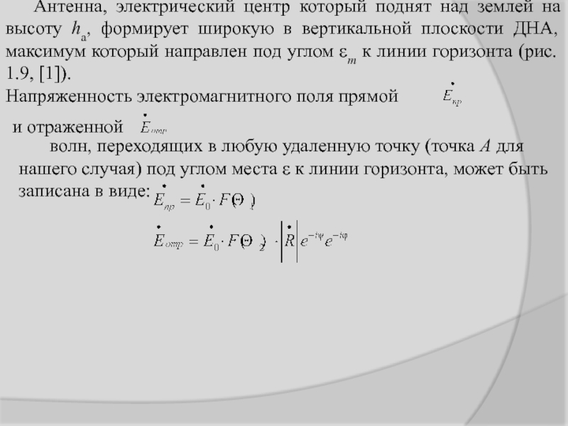 волн, переходящих в любую удаленную точку (точка А для нашего случая) под углом места к линии горизонта, может быть записана в виде: