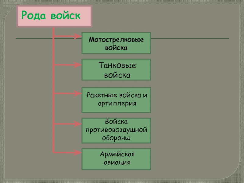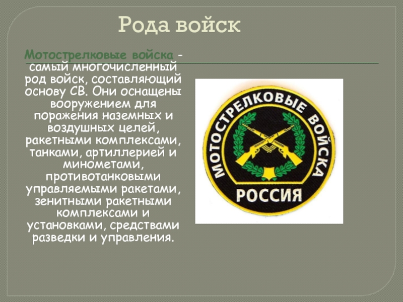 Рода войскМотострелковые войска - самый многочисленный род войск, составляющий основу СВ. Они оснащены вооружением для поражения наземных и