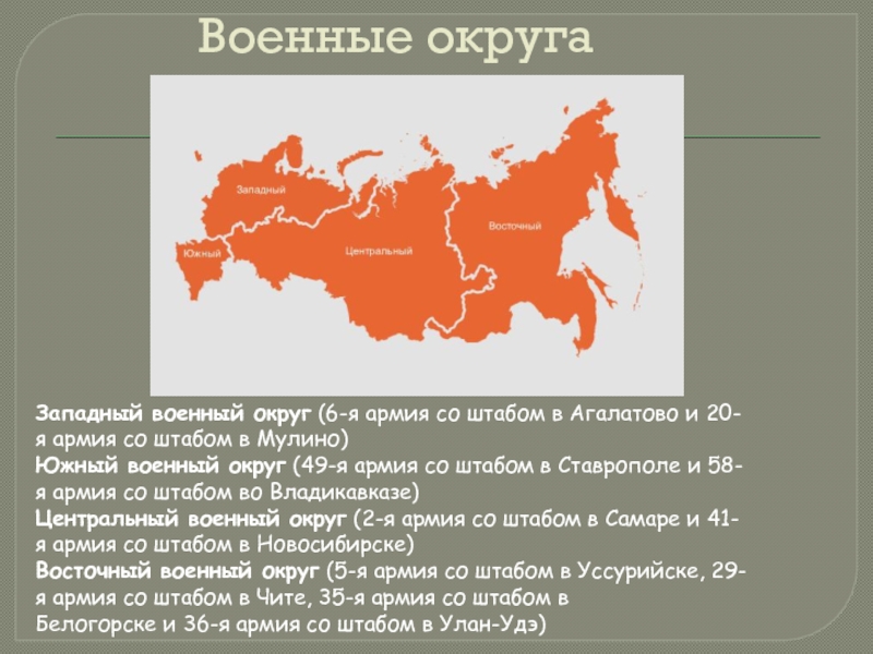 Военные округаЗападный военный округ (6-я армия со штабом в Агалатово и 20-я армия со штабом в Мулино)Южный военный округ (49-я армия со штабом в
