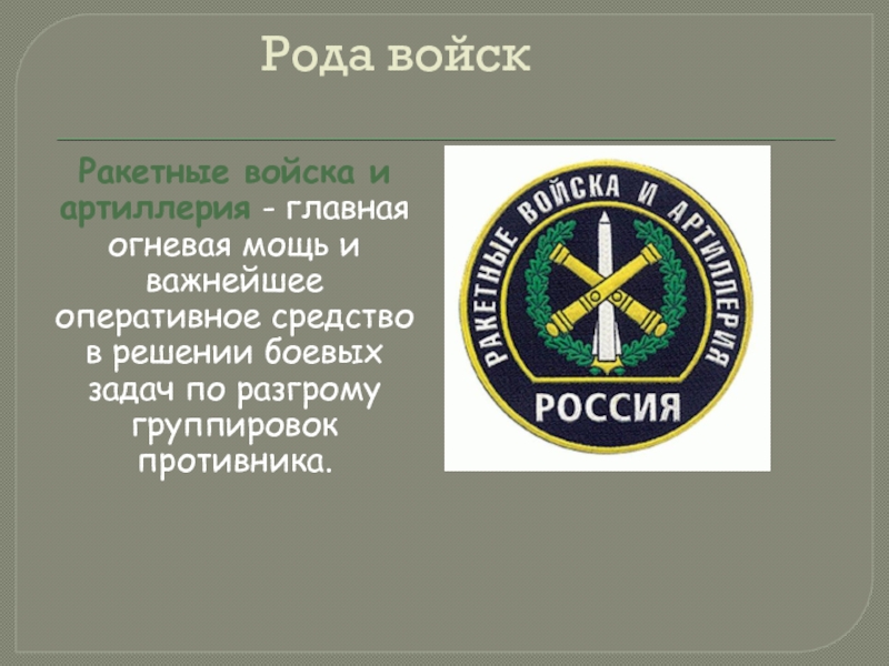 Рода войскРакетные войска и артиллерия - главная огневая мощь и важнейшее оперативное средство в решении боевых задач по