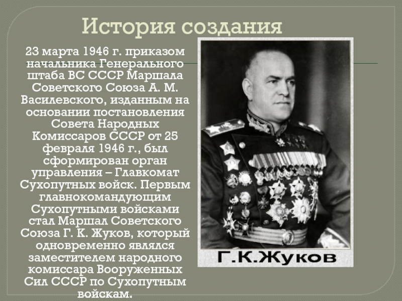 постановления Совета Народных Комиссаров СССР от 25 февраля 1946 г., был сформирован орган управления – Главкомат Сухопутных войск. Первым главнокомандующим Сухопутными войсками стал Маршал Советского Союза Г. К. Жуков, который одновременно являлся заместителем народного комиссара Вооруженных Сил СССР по Сухопутным войскам.