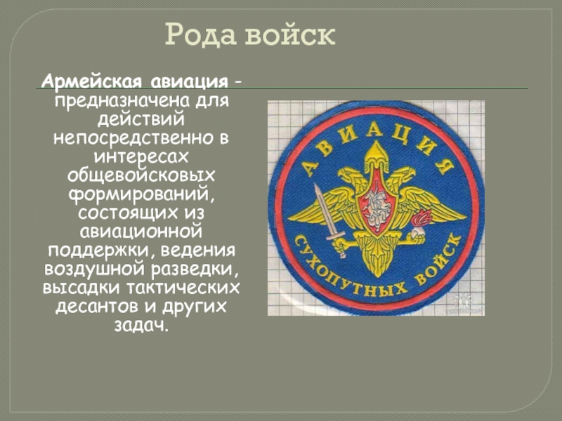 Рода войскАрмейская авиация - предназначена для действий непосредственно в интересах общевойсковых формирований, состоящих из авиационной поддержки, ведения воздушной