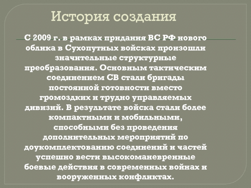 История созданияС 2009 г. в рамках придания ВС РФ нового облика в Сухопутных войсках произошли значительные структурные