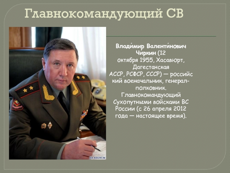 Главнокомандующий СВВлади́мир Валенти́нович Чи́ркин (12 октября 1955, Хасавюрт, Дагестанская АССР, РСФСР, СССР) — российский военачальник, генерал-полковник. Главнокомандующий Сухопутными войсками ВС России (с 26 апреля 2012 года — настоящее время).