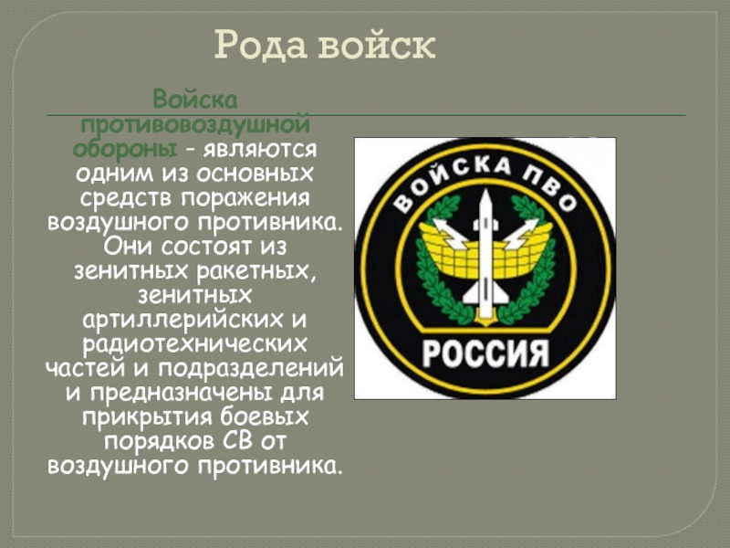 Рода войскВойска противовоздушной обороны - являются одним из основных средств поражения воздушного противника. Они состоят из зенитных ракетных,