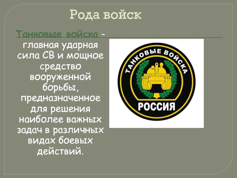 Рода войскТанковые войска - главная ударная сила СВ и мощное средство вооруженной борьбы, предназначенное для решения наиболее важных