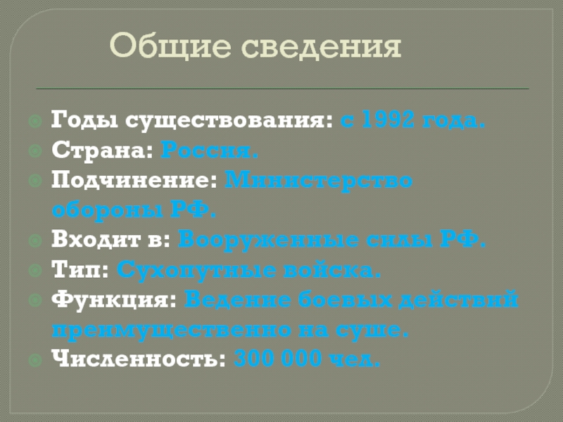 Общие сведенияГоды существования: с 1992 года.Страна: Россия.Подчинение: Министерство обороны РФ.Входит в: Вооруженные силы РФ.Тип: Сухопутные войска.Функция: Ведение боевых действий преимущественно на суше.Численность: 300 000 чел.