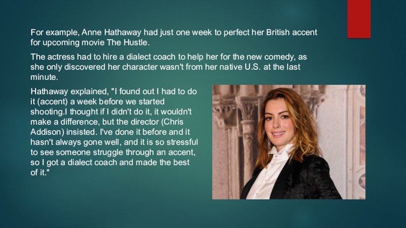 Hathaway explained, "I found out I had to do it (accent) a week before we started shooting.I thought if I didn't do it, it wouldn't make a difference, but the director (Chris Addison) insisted. I've done it before and it hasn't always gone well, and it is so stressful to see someone struggle through an accent, so I got a dialect coach and made the best of it."