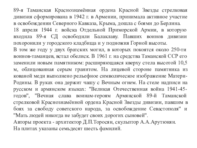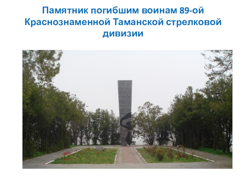 Слайд 2Памятник погибшим воинам 89-ой Краснознаменной Таманской стрелковой дивизии
