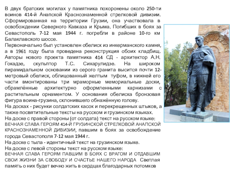 ВЕЧНАЯ СЛАВА ГЕРОЯМ 414-Й ГРУЗИНСКОЙ СТРЕЛКОВОЙ АНАПСКОЙ КРАСНОЗНАМЕННОЙ ДИВИЗИИ, павшим в боях за освобождение города Севастополя 7-12 мая 1944 г.