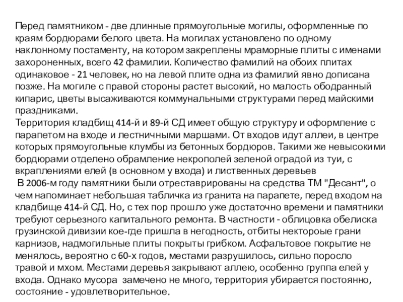 Слайд 6Перед памятником - две длинные прямоугольные могилы, оформленные по краям