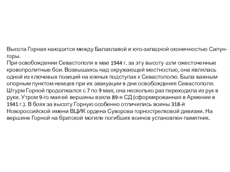 кровопролитные бои. Возвышаясь над окружающей местностью, она являлась одной из ключевых позиций на южных подступах к Севастополю. Была важным опорным пунктом немцев при их эвакуации в дни освобождения Севастополя. Штурм Горной продолжался с 7 по 9 мая, она несколько раз переходила из рук в руки. Утром 9-го мая её вершины взяла 89-я СД (сформированная в Армении в 1941 г.). В боях за высоту Горную особенно отличились воины 318-й Новороссийской имени ВЦИК ордена Суворова горнострелковой дивизии. На вершине Горной на братской могиле погибших воинов установлен памятник.