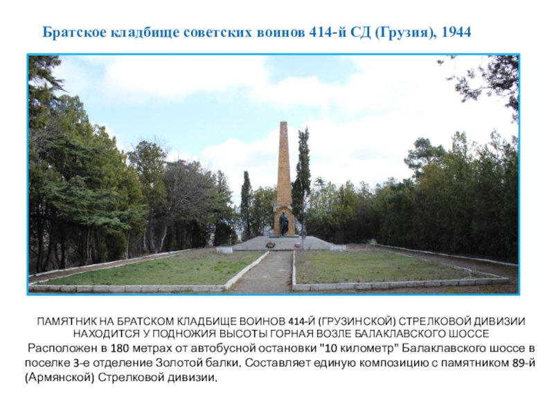 Слайд 4Братское кладбище советских воинов 414-й СД (Грузия), 1944