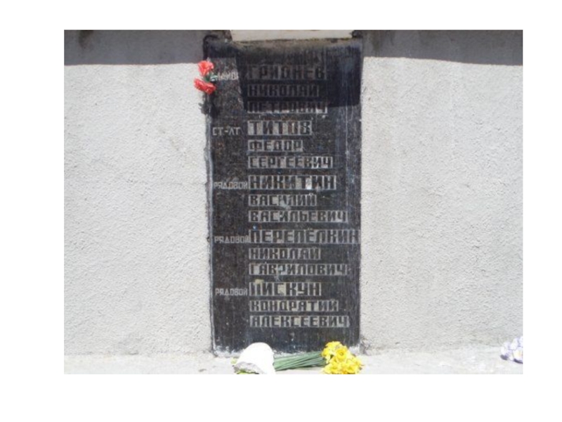 Майор Гриднев Николай Петрович. Ст-лт. Титов Федор Сергеевич. Рядовой Никитин Василий Васильевич. Рядовой Перепелкин Николай Гаврилович. Рядовой Пискун Кондратий Алексеевич.