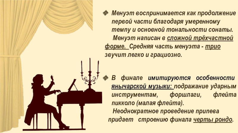Менуэт написан в сложной трёхчастной форме. Средняя часть менуэта - трио звучит легко и грациозно.