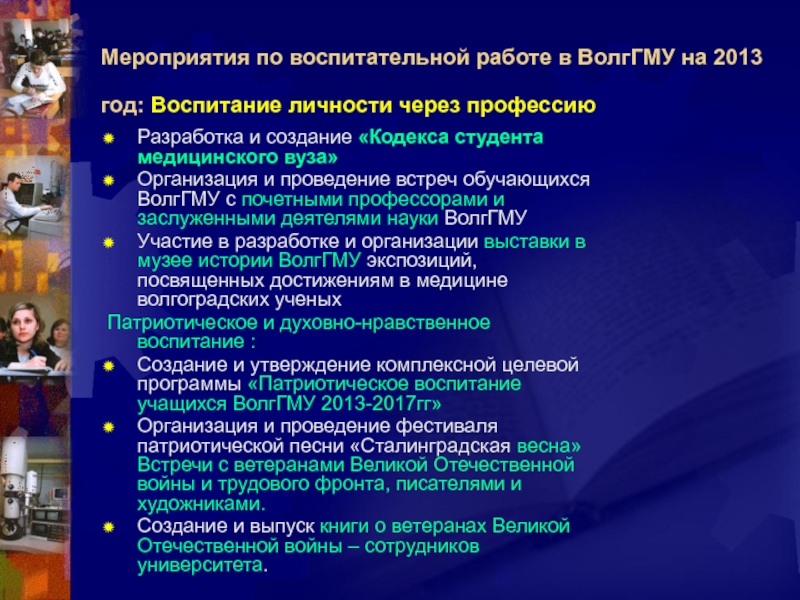 Слайд 41Мероприятия по воспитательной работе в ВолгГМУ на 2013 год: Воспитание