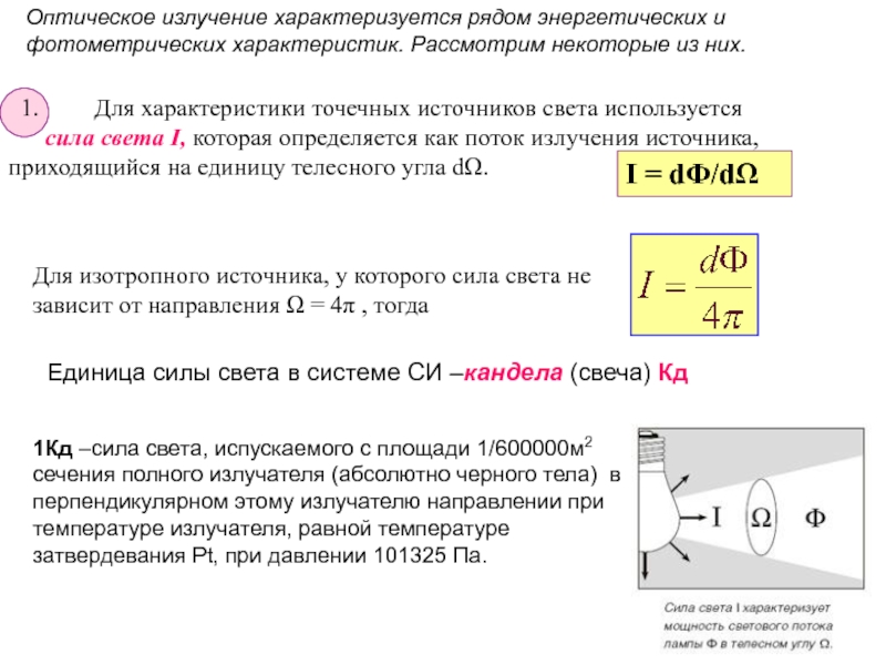 1Кд –сила света, испускаемого с площади 1/600000м2 сечения полного излучателя (абсолютно черного тела) в перпендикулярном этому излучателю направлении при температуре излучателя, равной температуре затвердевания Pt, при давлении 101325 Па.