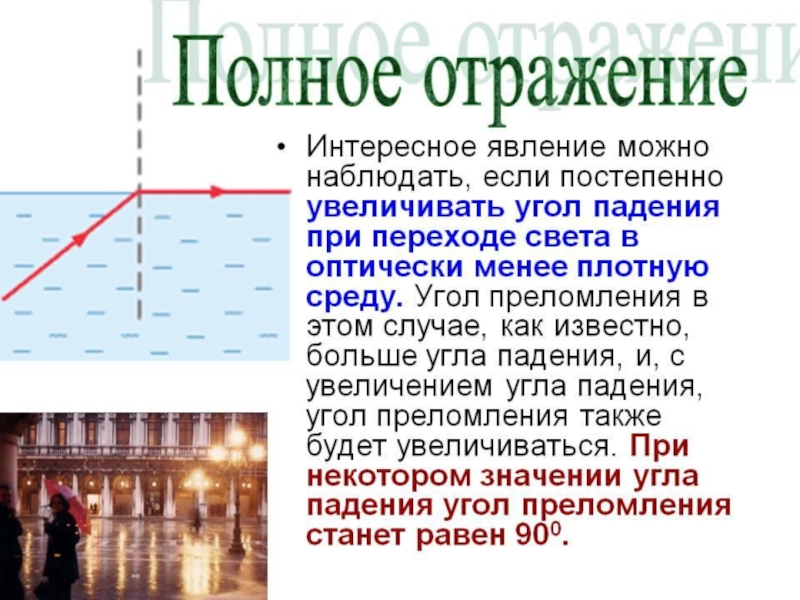 При α > α0 луч не преломляется, а полностью отражается обратно в первую среду. Это называется полным внутренним отражением.