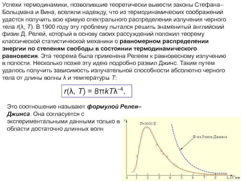 распределения излучения черного тела r(λ, T). В 1900 году эту проблему пытался решить знаменитый английский физик Д. Релей, который в основу своих рассуждений положил теорему классической статистической механики о равномерном распределении энергии по степеням свободы в состоянии термодинамического равновесия. Эта теорема была применена Релеем к равновесному излучению в полости. Несколько позже эту идею подробно развил Джинс. Таким путем удалось получить зависимость излучательной способности абсолютно черного тела от длины волны λ и температуры T: