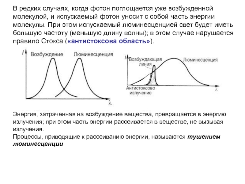 испускаемый люминесценцией свет будет иметь большую частоту (меньшую длину волны); в этом случае нарушается правило Стокса («антистоксова область»).