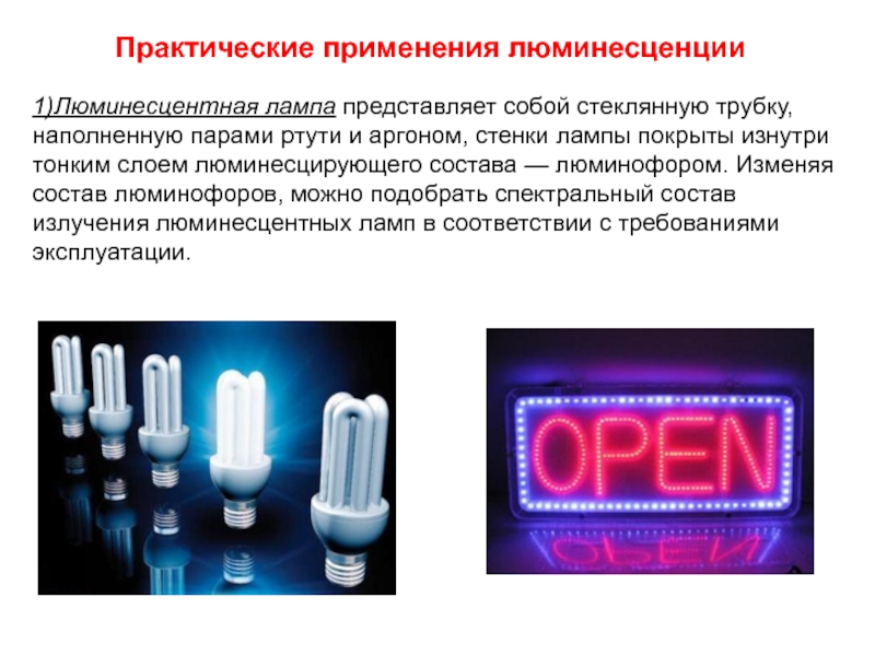 1)Люминесцентная лампа представляет собой стеклянную трубку, наполненную