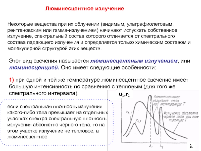 1) при одной и той же температуре люминесцентное свечение имеет большую интенсивность по сравнению с тепловым (для того же спектрального интервала).