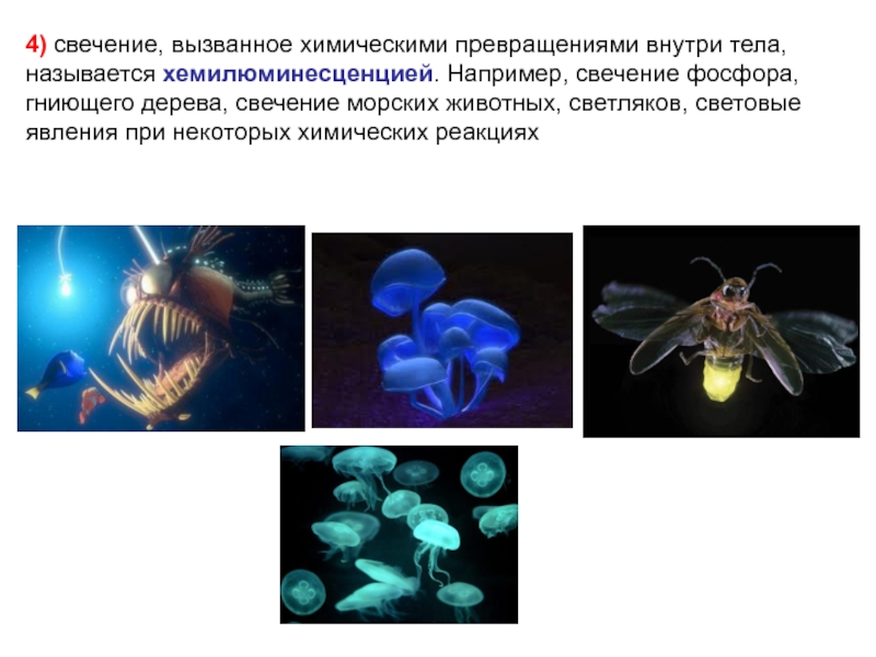 Слайд 874) свечение, вызванное химическими превращениями внутри тела, называется хемилюминесценцией. Например,