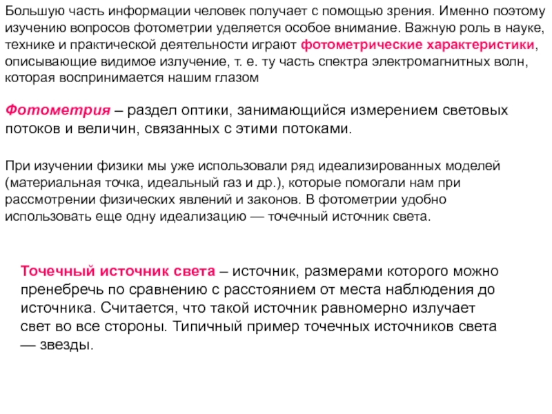 При изучении физики мы уже использовали ряд идеализированных моделей (материальная точка, идеальный газ и др.), которые помогали нам при рассмотрении физических явлений и законов. В фотометрии удобно использовать еще одну идеализацию — точечный источник света.