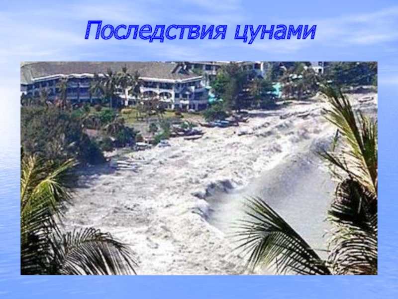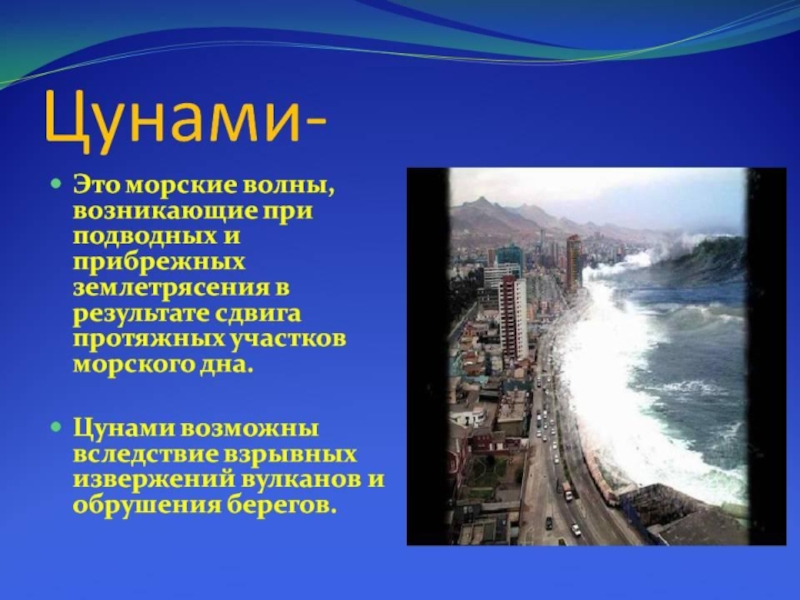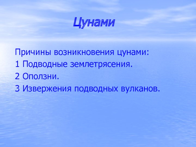 ЦунамиПричины возникновения цунами:1 Подводные землетрясения.2 Оползни.3 Извержения подводных вулканов.