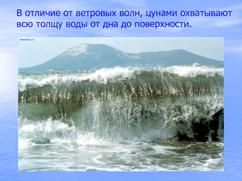 Слайд 8В отличие от ветровых волн, цунами охватывают всю толщу воды