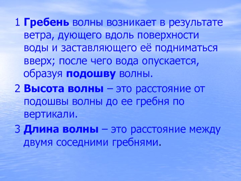 1 Гребень волны возникает в результате ветра, дующего вдоль поверхности воды и заставляющего её подниматься вверх; после