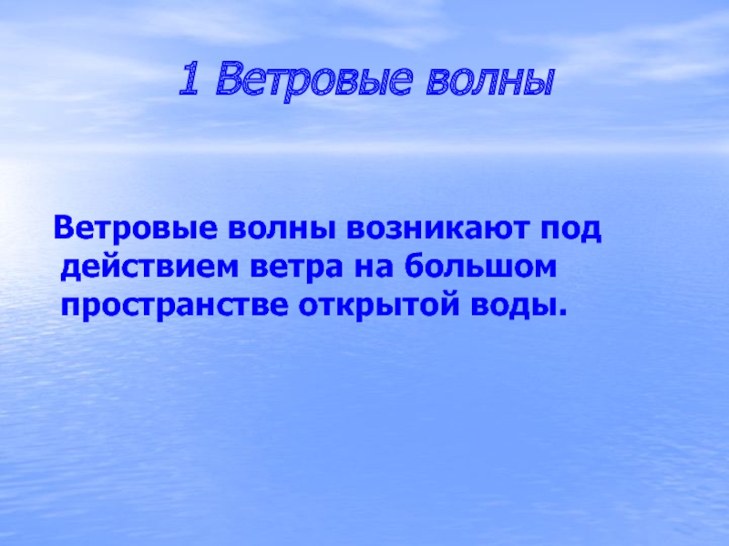 1 Ветровые волны Ветровые волны возникают под действием ветра на большом пространстве открытой воды.