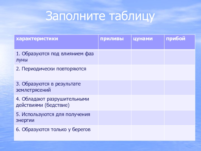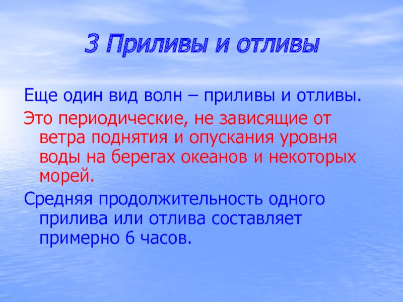 3 Приливы и отливыЕще один вид волн – приливы и отливы.Это периодические, не зависящие от ветра поднятия