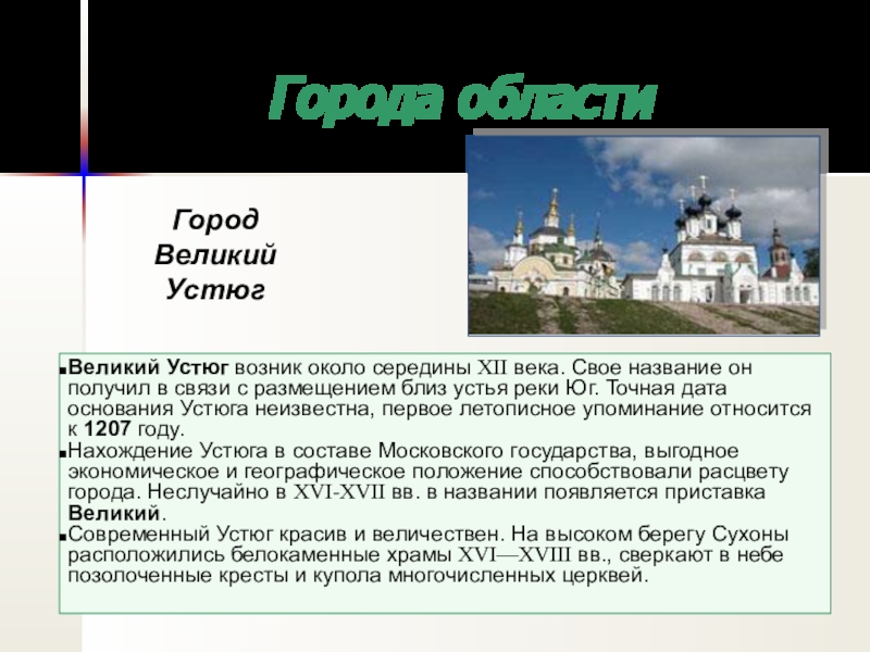Нахождение Устюга в составе Московского государства, выгодное экономическое и географическое положение способствовали расцвету города. Неслучайно в XVI-XVII вв. в названии появляется приставка Великий.