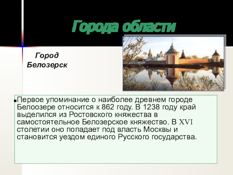 в самостоятельное Белозерское княжество. В XVI столетии оно попадает под власть Москвы и становится уездом единого Русского государства.