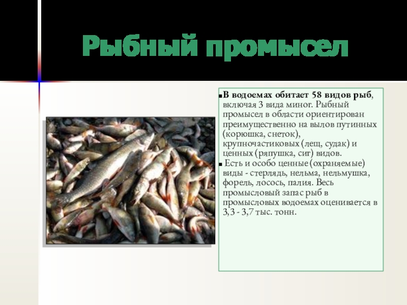 миног. Рыбный промысел в области ориентирован преимущественно на вылов путинных