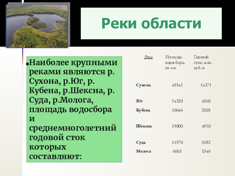 Наиболее крупными реками являются р.Сухона, р.Юг, р.Кубена, р.Шексна, р.Суда,