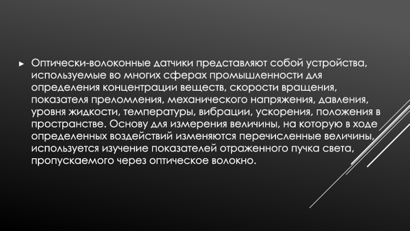 Слайд 3Оптически-волоконные датчики представляют собой устройства, используемые во многих сферах промышленности