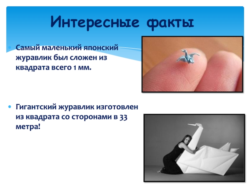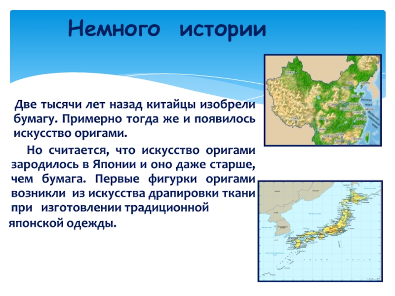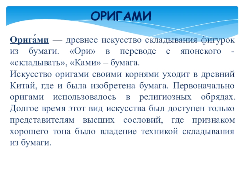 корнями уходит в древний Китай, где и была изобретена бумага. Первоначально оригами использовалось в религиозных обрядах. Долгое время этот вид искусства был доступен только представителям высших сословий, где признаком хорошего тона было владение техникой складывания из бумаги. ОРИГАМИ