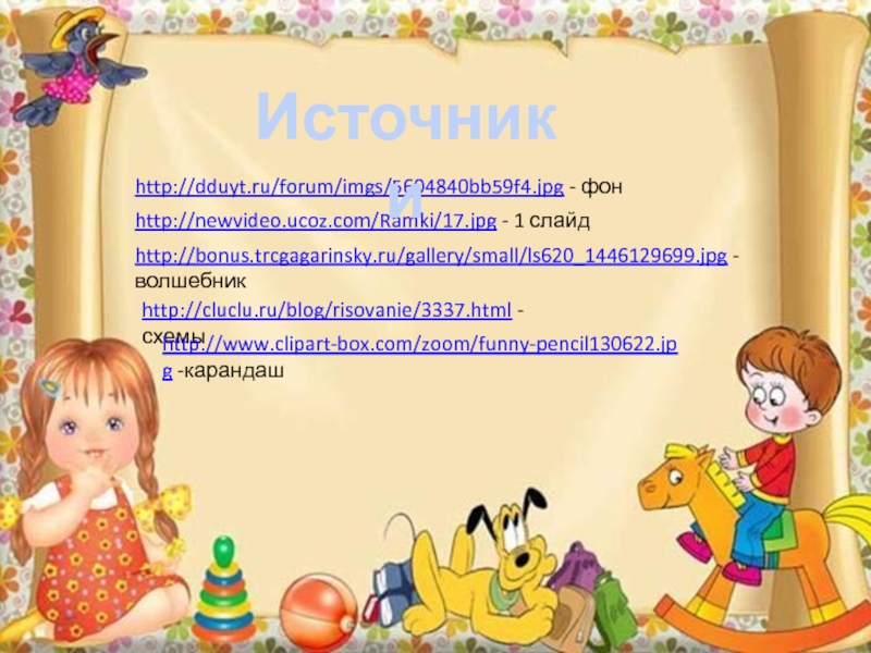 http://newvideo.ucoz.com/Ramki/17.jpg - 1 слайдhttp://bonus.trcgagarinsky.ru/gallery/small/ls620_1446129699.jpg - волшебникhttp://dduyt.ru/forum/imgs/5604840bb59f4.jpg - фонhttp://cluclu.ru/blog/risovanie/3337.html - схемыИсточники http://www.clipart-box.com/zoom/funny-pencil130622.jpg -карандаш
