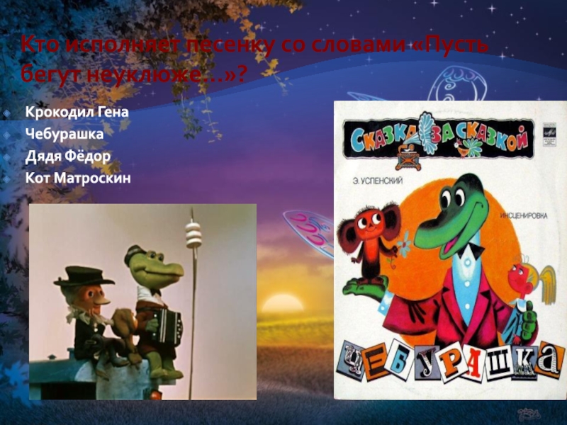 Слайд 19Кто исполняет песенку со словами «Пусть бегут неуклюже…»?