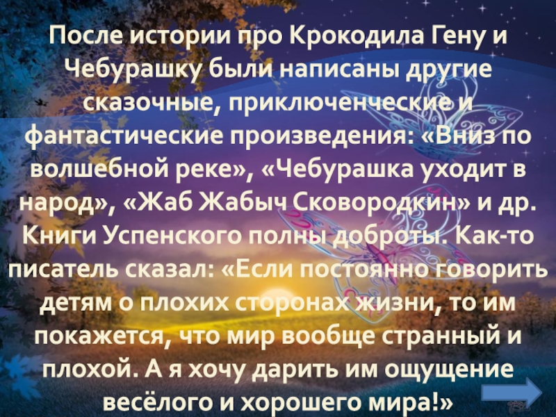 уходит в народ», «Жаб Жабыч Сковородкин» и др. Книги Успенского полны доброты. Как-то писатель сказал: «Если постоянно говорить детям о плохих сторонах жизни, то им покажется, что мир вообще странный и плохой. А я хочу дарить им ощущение весёлого и хорошего мира!»