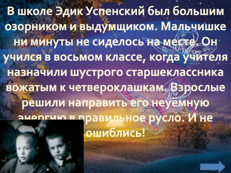 Слайд 6В школе Эдик Успенский был большим озорником и выдумщиком. Мальчишке